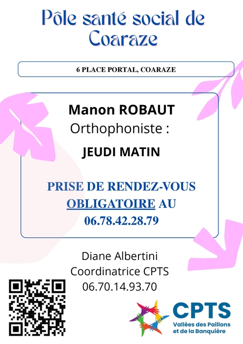 Le Pôle Santé accueille à partir d’octobre Manon Robaut, orthophoniste, pour des consultations spécialisées sur rendez-vous.