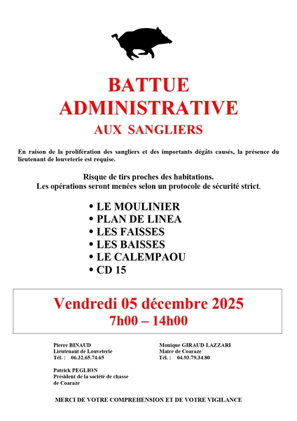 Cette battue a pour objectif de limiter les dégâts causés par les sangliers. Des tirs peuvent être entendus à proximité des habitations. Les habitants doivent rester vigilants pendant l’opération. Le lieutenant de louveterie, Monsieur BINAUD, supervisera la battue pour assurer la sécurité de tous.
