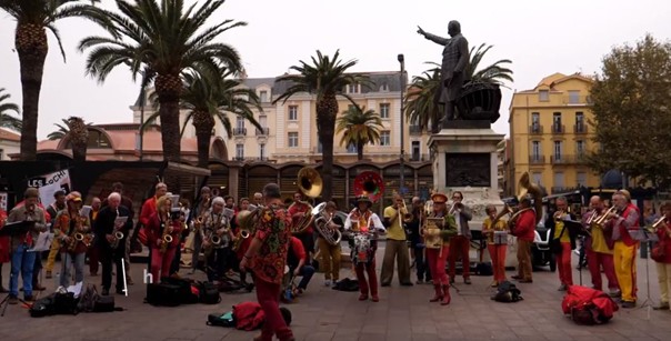 Une fanfare du Grand Sud, méditerranéenne et colorée, composée de trompettes, trombones,tubas de toutes nationalités et de tous gabarits, saxhorns, tubas barytons, tubas basses, soubassophones, euphoniums, et encore d’autres… Il y a des bois aussi, et des bois en cuivre, flûtes traversières altos, piccolos, clarinettes, saxophones sopranos, altos, ténors, barytons, et des percussions, grosses caisses, caisses claires, cymbales, washboard, …