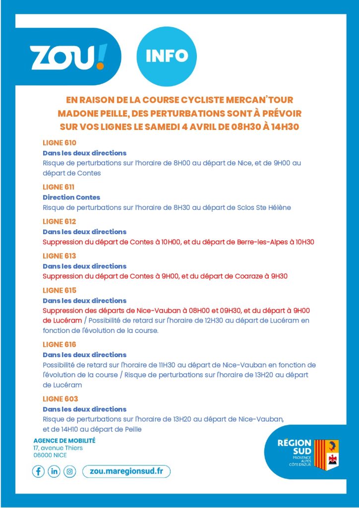 À l’occasion de la course cycliste Mercan’tour Madone Peille, qui traversera les vallées du Paillon ce samedi 4 avril 2026 entre 08h30 et 14h30, des perturbations sont à prévoir sur plusieurs lignes de bus.